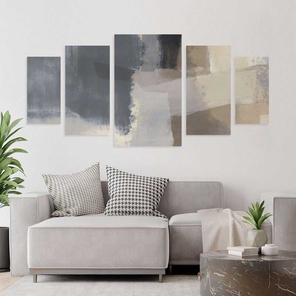 طقم لوحات فن تجريدي مكون من خمسة لوحات مقاس لوحتين 30.60سم ولوحتين 40.80 ولوحة 100.60سم إجمالي اللوحة عرض 200سم . ارتقاع 100سم